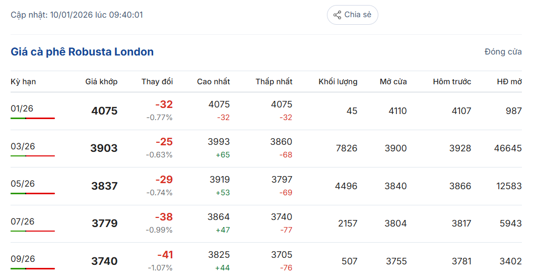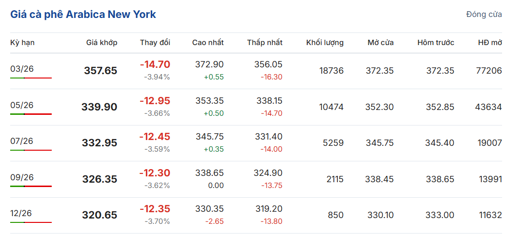 Giá Arabica đồng loạt giảm rất mạnh trên tất cả các kỳ hạn, mức giảm lên tới 12–15 USD/tấn, tương đương gần 4%.