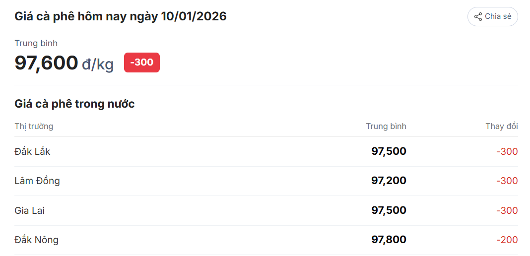 + Đắk Lắk: khoảng 97.500 đồng/kg (giảm 300 đồng/kg)