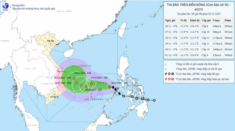 Theo Trung tâm Dự báo Khí tượng Thủy văn Quốc gia, hồi 4 giờ ngày 26/11, vị trí tâm bão số 15 ở vào khoảng 12,2 độ Vĩ Bắc; 119,1 độ Kinh Đông, cách đảo Song Tử Tây khoảng 540km về phía Đông. Sức gió mạnh nhất vùng gần tâm bão mạnh cấp 8 (62-74km/giờ), giật cấp 10. Di chuyển theo hướng Tây Bắc với tốc độ 20-25km/h.
