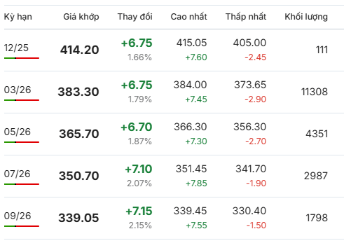 Trên sàn giao dịch New York, giá cà phê arabica kỳ hạn giao tháng 12/2025 tăng 6.75 cent/pound, lên mức 414.20 cent/pound; giá cà phê giao tháng 03/2026 tăng 6.75 cent/pound, lên mức 383.30 cent/pound; giá cà phê giao tháng 05/2026 tăng 6.70 cent/pound, lên mức 365.70 cent/pound.